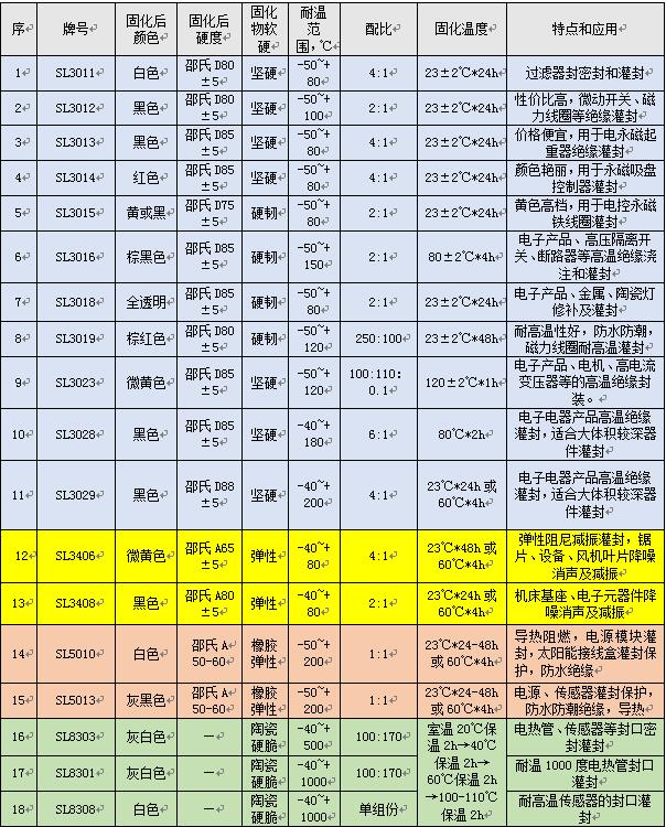 種類(lèi)繁多的灌封膠又如何選擇呢?作為灌封膠的使用單位需要查看哪些性能數(shù)據(jù)才能對(duì)選擇灌封膠有幫助呢?下表是世林膠業(yè)在灌封膠方面的產(chǎn)品,可供您選擇參考,這里列舉的產(chǎn)品種類(lèi)很多,功能也各不相同,如果您還有其他的特殊要求也可以和世林的工廠(chǎng)技術(shù)人員進(jìn)行交流,只有清楚知道您的實(shí)際用膠需求,我們才能給您提供全套的灌封用膠的解決方案。