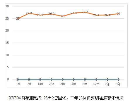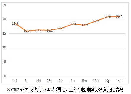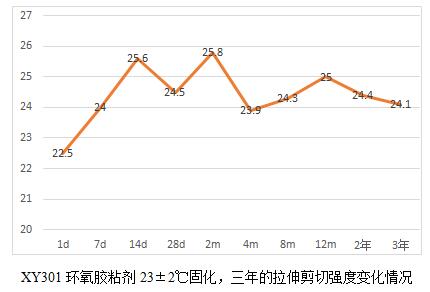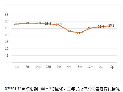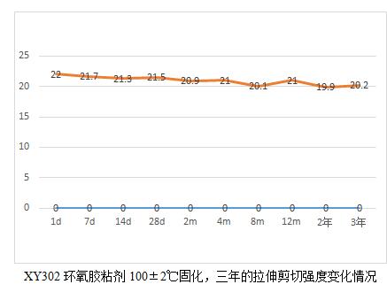XY304環(huán)氧膠粘劑的耐老化有19.6年的實測數(shù)據(jù)。鑒于現(xiàn)在軍工用膠粘劑品種有新增且部分原材料供貨廠家也發(fā)生了變化,為了真實了解這些材料的耐老化情況,我們將公司的環(huán)氧類型的膠粘劑產(chǎn)品做了一個25年老化的計劃,并于2018年元月開始,預計整個試驗到2043年結束。