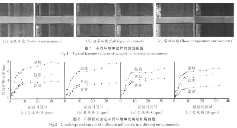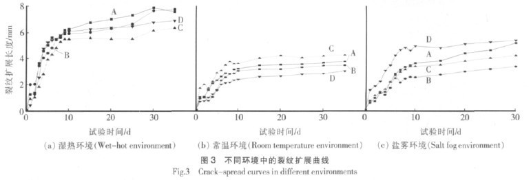 依次為 D>A>B>C 常溫環(huán)境中,種規(guī)格膠粘劑的裂紋擴(kuò)展由快到慢依次為 C>A>B>D 鹽霧環(huán)境中,種規(guī)格膠粘劑的裂紋擴(kuò)展由快到慢依次為 D>A>C>B。